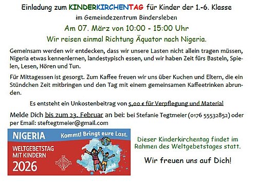 Der nächste KinderKirchenTag findet am 7. März 2026 im Gemeindezentrum in Bindersleben statt. Der erste im neuen Jahr steht immer unter dem selben Motto wie der Weltgebetstag. Diese Jahr sind wir virtuell zu Besuch in Nigeria. Kinder der 1. bis 6. Klassen sind herzlich eingeladen, diesen KinderKirchenTag gemeinsam zu feiern. Zwecks Vorbereitung bitten wir um eine Anmeldung: