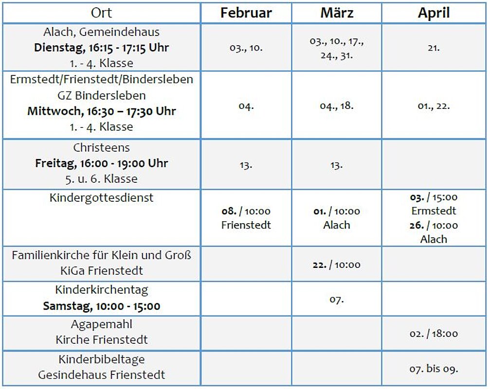 Die Familiengottesdienste wie auch die Gottesdienste mit separatem KiGo sind im Gottesdienstplan ausgewiesen. Diesen findet ihr immer im Gemeindeblatt.